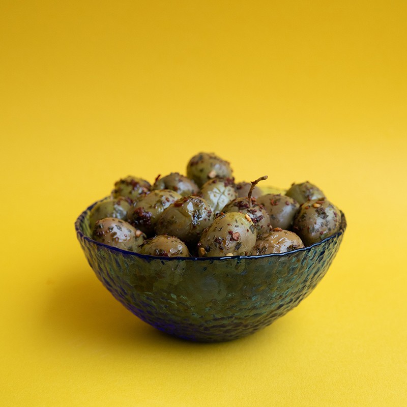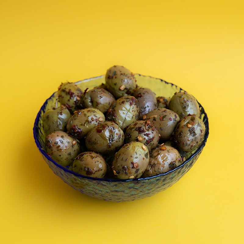 Le olive verdi condite sono una vera leccornia; dal sapore deciso, queste olive vengono condite con olio extravergine di oliva, peperoncino, aromi vari. Ideali come antipasto, si accompagnano piacevolmente ad un secondo o addirittura possono essere usate come companatico.